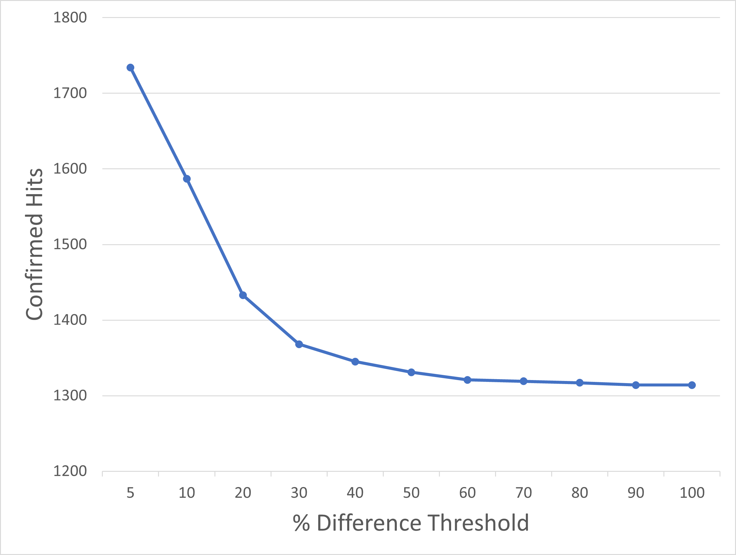 After analysis of the 82,314 background ions, scientists discovered that a threshold of 55% difference in peak areas between background ions and the potential hits captured approximately 97% of all the potential cross-hits.