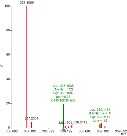 In affinity selection-mass spectrometry (AS-MS), one of the more challenging-to-discern causes of false positives is compound misidentification due to isotopic pattern overlap. These errors occur when the X+1 of one compound is perceived as the C12 of another compound. This can also happen at the X+2 level. This error is particularly perilous because it can affect both the original hit as well as the background hit.