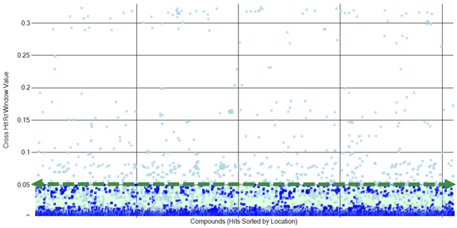 Using data from a high-throughput screen of 250,000 compounds across 96 samples, Virscidian took a deep dive into the data to determine the typical retention time window between cross-hits.